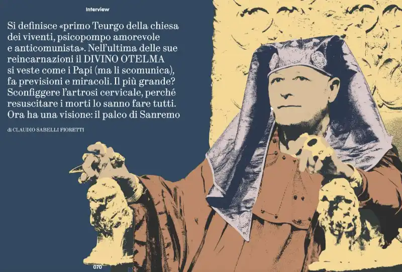 VITA OPERE E RESURREZIONI DI MARCO AMLETO BELELLI, ALIAS IL DIVINO OTELMA, O “IL PRIMO TEURGO DELLA CHIESA DEI VIVENTI”: “L’ULTIMA PREVISIONE? DICEMMO CHE AVREBBE VINTO TRUMP, IL TEUTONE. TUTTI DICEVANO NEGRINDA… SÌ, KAMALA HARRIS. MA TRUMP NON CI PIACE MOLTO. ANTEPONE I SUOI SPORCHI INTERESSI PERSONALI A QUELLI DEGLI AMERICANI. GIORGIA MELONI ARRIVERÀ ALLA FINE DELLA LEGISLATURA. NESSUNO È IN GRADO DI RICACCIARLA ALLA POSIZIONE DI PARTENZA” – “RENZI HA PERSO PERCHÉ È ANTIPATICO. UN RAGAZZOTTO CONVINTO DI ESSERE IL PIÙ FURBO DEL REAME E CHE GLI ALTRI SIANO TUTTI DEI POVERI IDIOTI. ALLA FINE È RISULTATO CHE GLI ITALIANI ERANO PIÙ INTELLIGENTI E L’IDIOTA ERA LUI” – “PRIMA CI CHIAMAVAMO MAGO OTELMA, MA LA GENTE CI CONFONDEVA COL MAGO SILVAN” – L’INCIDENTE CON LA CIPRIANI, L’EVASIONE FISCALE E LE CANZONI: LA PIÙ GETTONATA È ‘IL GELATO’” TESTO: UN PO’ PORNO. “UN PO’ MOLLE UN PO’ DURO, HA LA FORMA DEL SILURO, C’È CHI LO LECCA C’È CHI LO SUCCHIA” – LA BOMBASTICA INTERVISTA BY SABELLI FIORETTI…